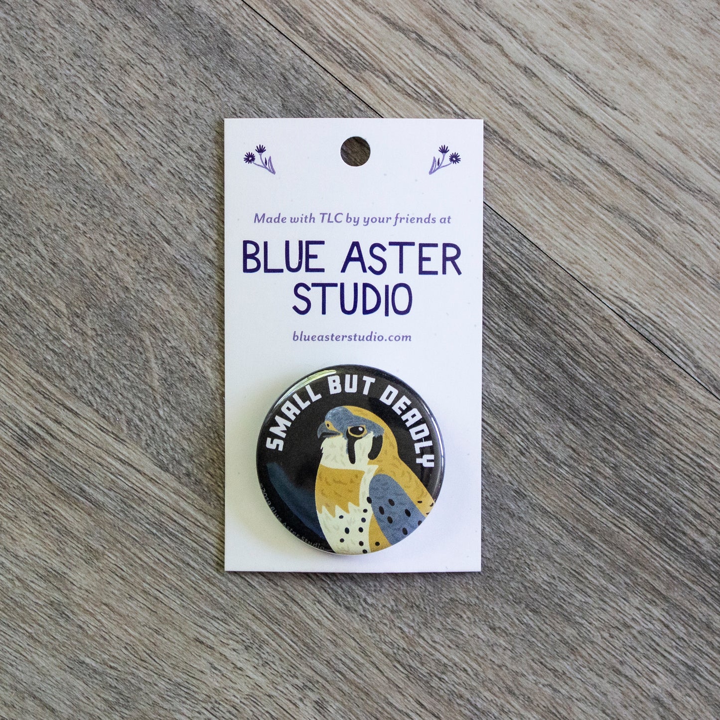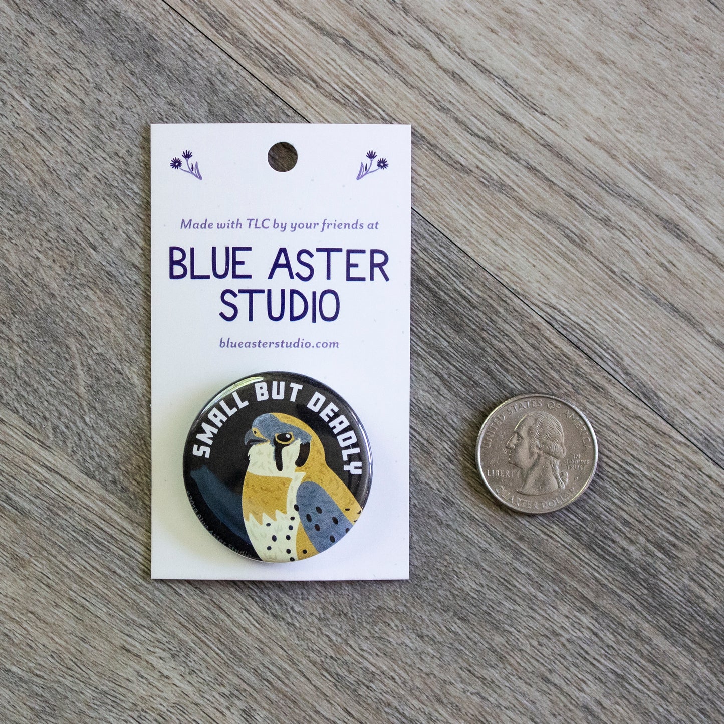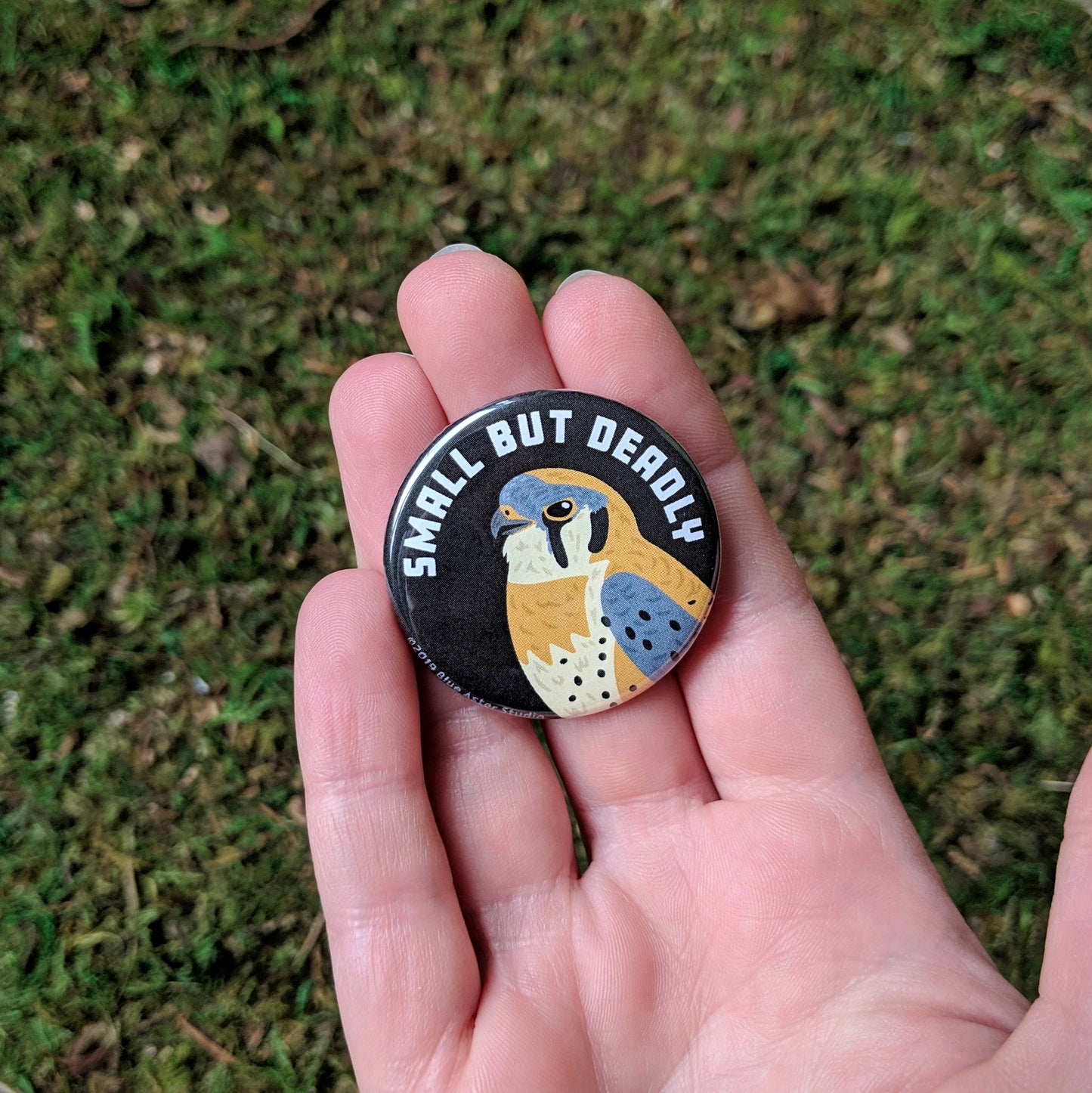 Kestrels are not to be messed with, and this button celebrates their ferocity. A cute kestrel illustration is accompanied by the text "small but deadly." Maybe it describes you, or a friend of yours! A great gift for the birder, falconer, or raptor rehabber in your life!