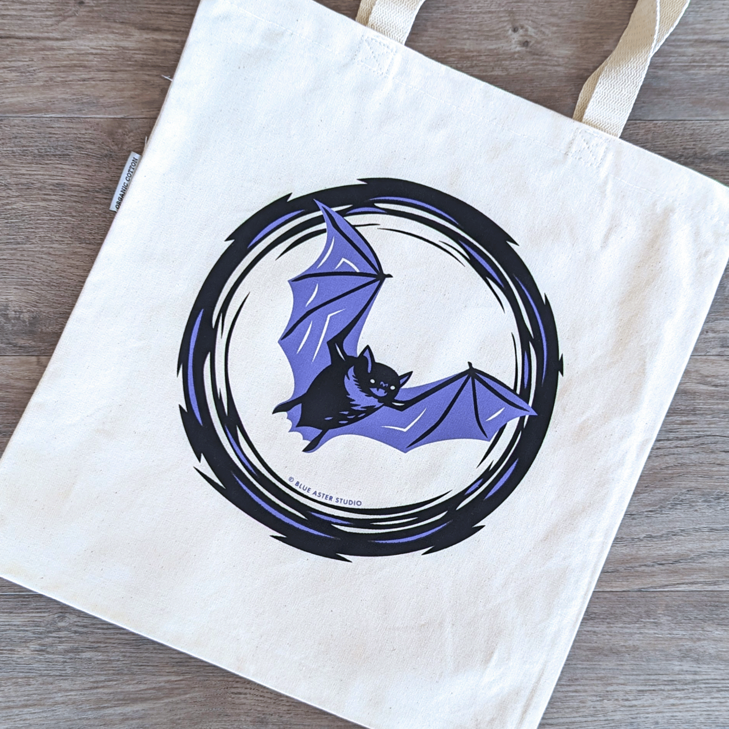 A tote bag with a flying bat design is just the accessory you've been looking for! This little sky puppy is sure to bring a smile to your face. While some people only bring out the bats at spooky season, we think they are a year round delight! Our organic cotton bag is durable and eco-friendly making it great for everyday use. From groceries to school books to your normal must haves, this bag can handle them all! The flying bat design is hand screen printed on each one with care.