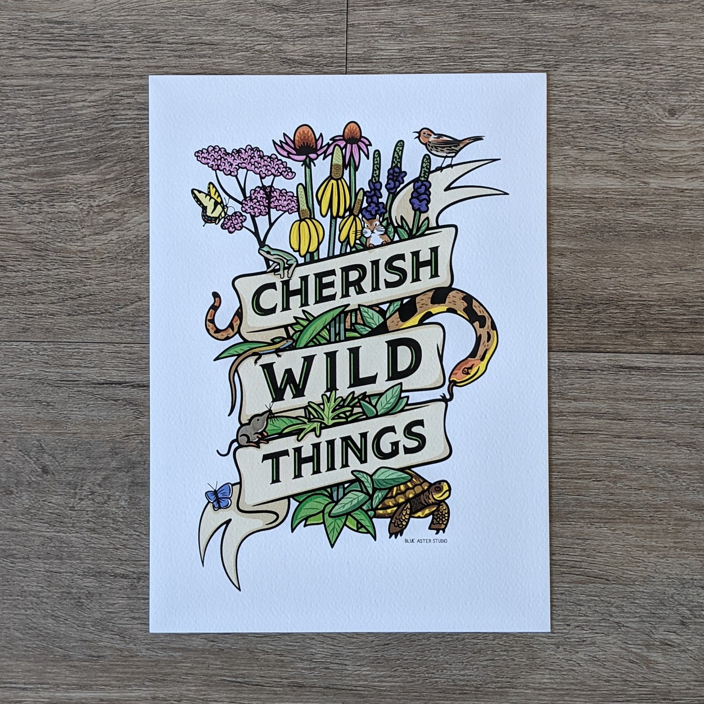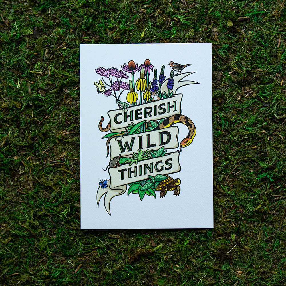 This lovely wildlife art print features cute animals and prairie plants! A ribbon reading 'Cherish Wild Things' wraps around an assortment of birds, pollinators, reptiles, amphibians and mammals. A perfect print for every prairie lover! Makes great office or home decor to show off your love for all things wild.