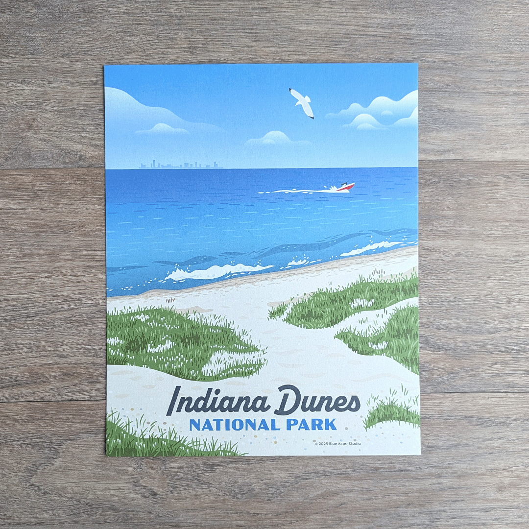 One of the newest additions to the US national park system, the Indiana Dunes stretches across the southern tip of Lake Michigan. Our illustrated scene makes you feel like you've just finished walking across the dunes to reach the lakeshore, where a gull gracefully glides above a boater zipping across the water. In the background, the Chicago skyline sits on the horizon. This is a great memento for anyone longing to hear the lapping surf of Lake Michigan and feel the sand between their toes!