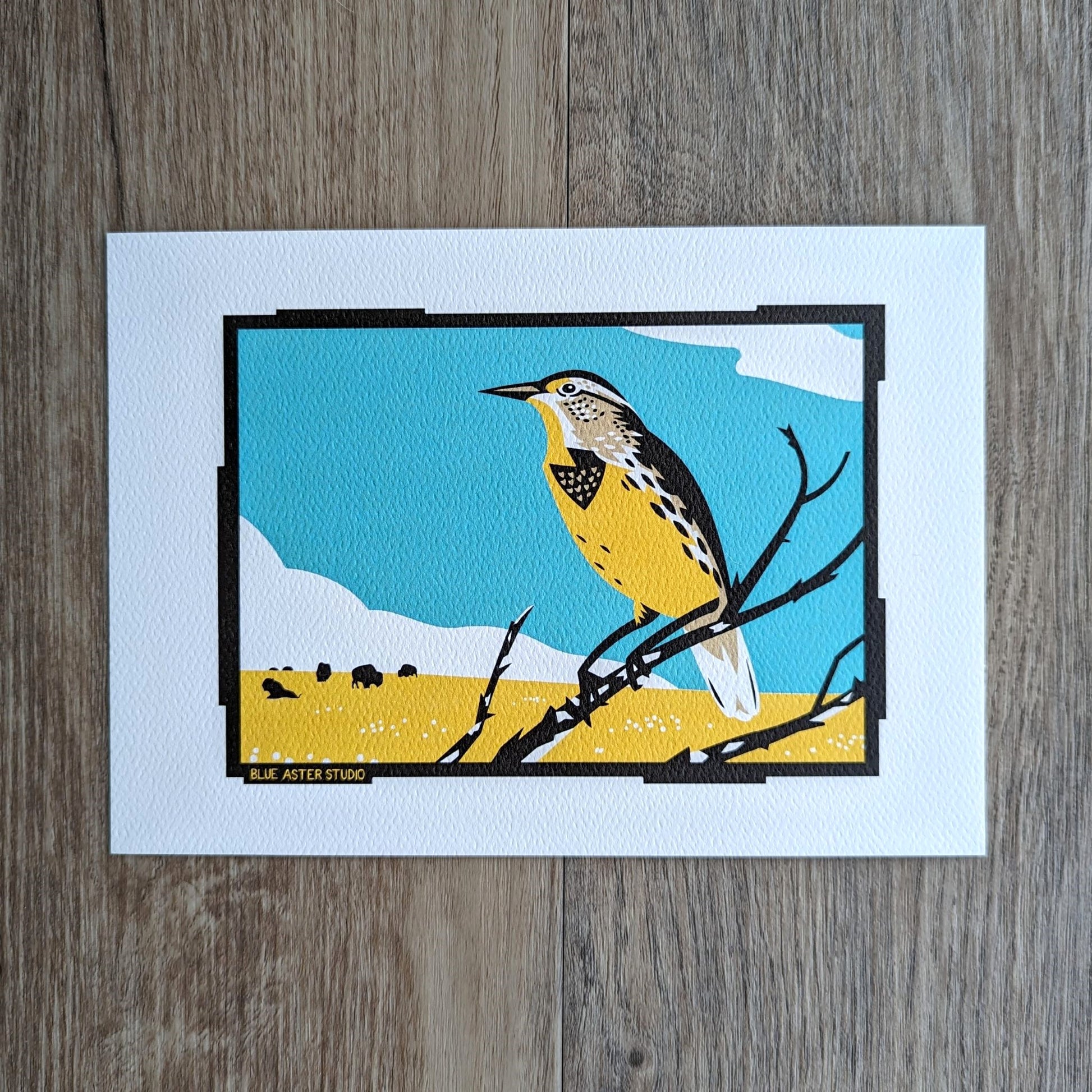 This bright art print of a meadowlark perched on a branch with a prairie and big cloudy sky stretching out behind it is sure to brighten any room it enters. There are even some bison in the distance, enjoying that prairie life. Bring the grasslands right into your home or office with this piece of artwork! Sure to be the delight of any birdwatcher, prairie enthusiast or conservationist!