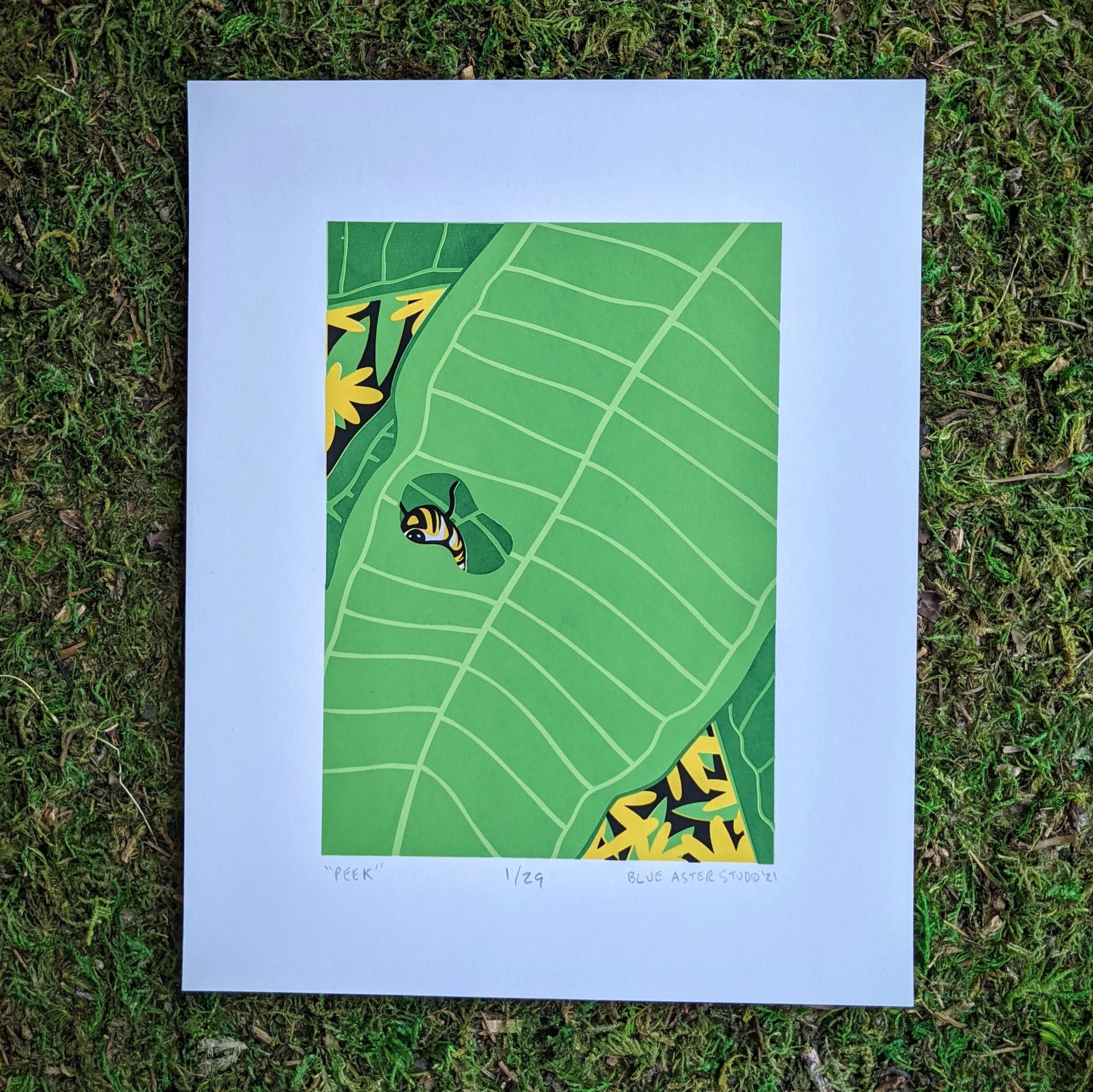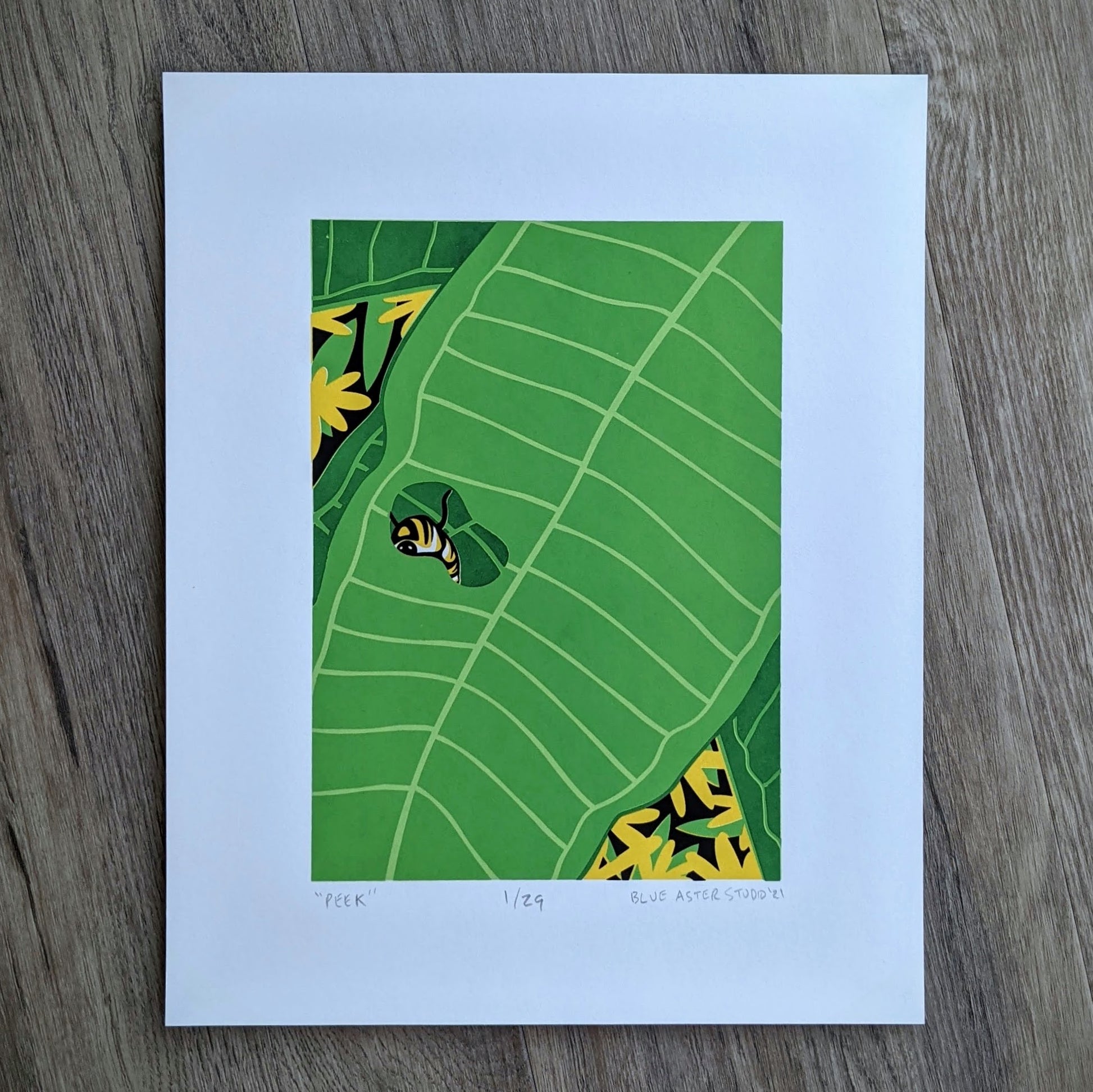We created this screen print to represent those fun, surprise meetings with monarch caterpillars in the garden. We are always delighted when we stumble upon these chubby little caterpillars chomping away on our milkweed. Here we have one that is taking advantage of a first instar hole in the milkweed leaf and peeking through. We love hosting monarchs in our pollinator gardens and use our interactions with the many critters who call our garden home as inspiration for our screen prints. This artwork would make a perfect gift for your gardener friends or anyone working to save the monarchs.