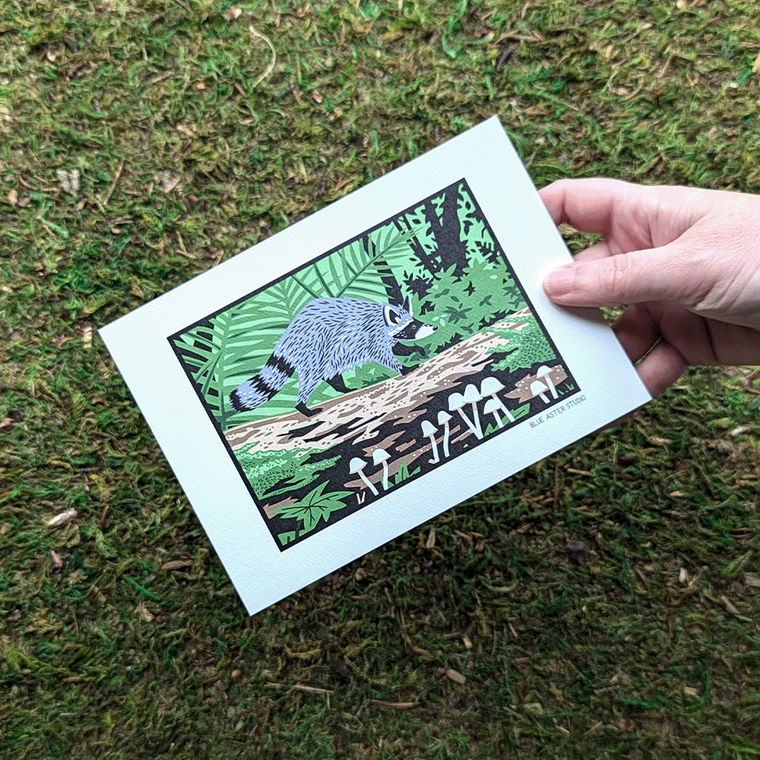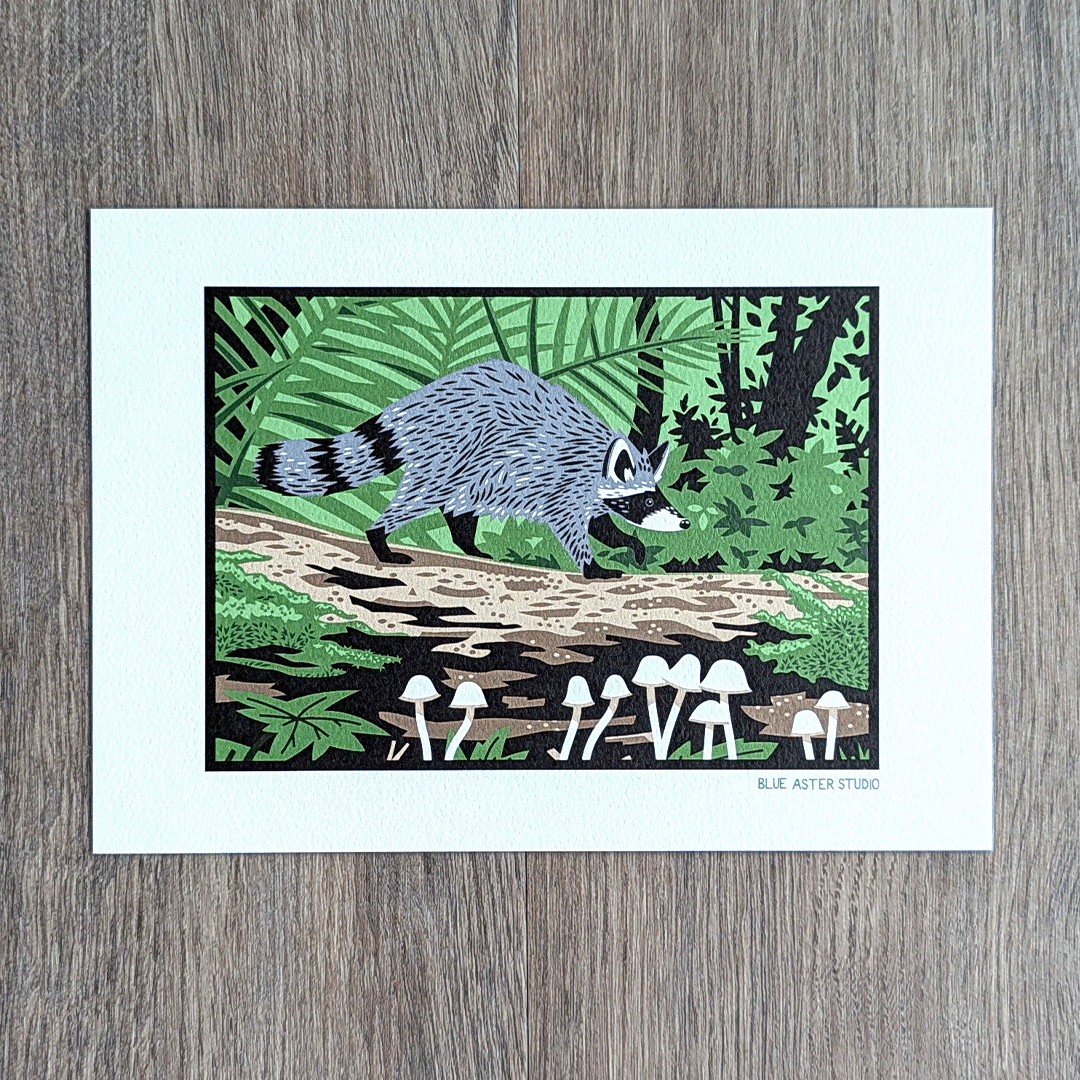 This art print of a raccoon trotting along a lush green trail is the perfect complement to our raccoon surrounded by fall foliage. The little raccoon is depicted crossing a fallen log which is covered in moss and mushrooms and surrounded by ferns and shrubs. This is a terrific gift for raccoon or nature lovers, and would look great on any wall in your home or office. Bring a little bit of nature inside with this print of a cute raccoon surrounded by everything the woods has to offer.